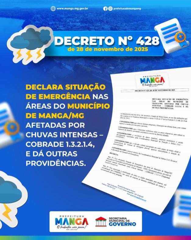A Prefeitura de Manga informa que foi publicado o Decreto nº 425, de 28 de novembro de 2025, que declara Situação de Emergência em áreas do município afetadas pelas fortes chuvas registradas nos últimos dias.